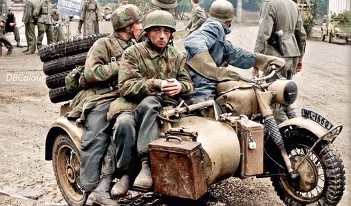 Three Fallschirmjäger and a motorcyclist wearing a coverall drillich and gauntlets, are poised on a BMW R75 and sidecar on the Route de Rouen in Grand-Bourgtheroulde, during the retreat from Normandy, late August 1944 .TN